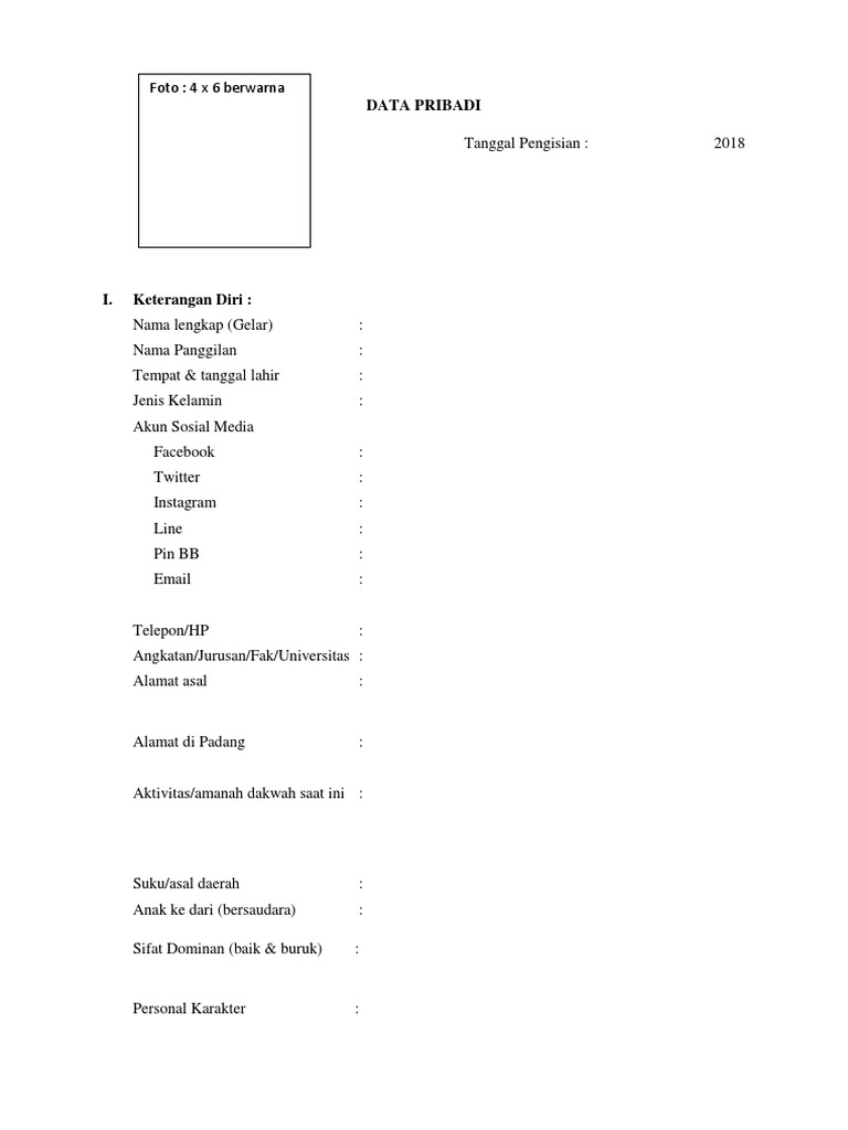 Format Biodata Taaruf 6nge795950lv from idoc.pub Contoh data diri staf i n spesifikasi uraian o 1 nama lengkap : Contoh agenda acara musyawarah besar. Apakah ada biodata lengkap di bawah? Adapun isi dari formulir biodata siswa ialah sebagai berikut: (lampirkan fotocopy) 8 no jamsostek : Dan pastinya meningkatkan kredibilitas pemilik biodata. Feb 04, 2019 · download contoh biodata diri lengkap word. Sama seperti karya tulis yang lainnya, biodata juga harus ditulis sesuai dengan struktur ya.